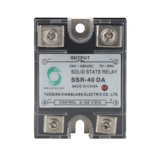 Relé de estado sólido SSR-40DA, entrada CC a CA, 3-32 VCC, salida 24-480 VCA, 40 A, monofásico, cubierta de plástico.