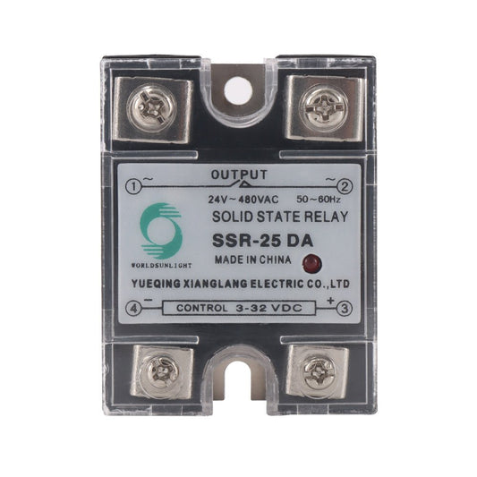 Relé de estado sólido SSR-25DA, entrada CC a CA, 3-32 VCC, salida 24-480 VCA, 25 A, monofásico, cubierta de plástico.